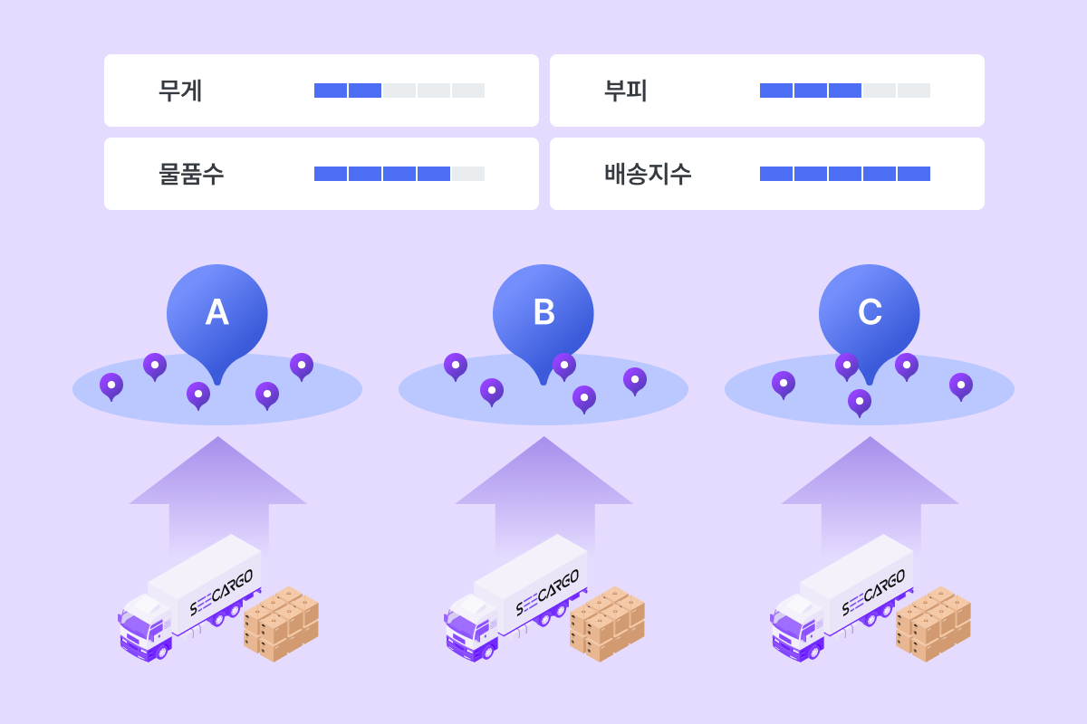 무게〮부피〮건수〮개수를 고려한 균등한 배차를 제공하며 추가로 거리〮시간을 고려하고