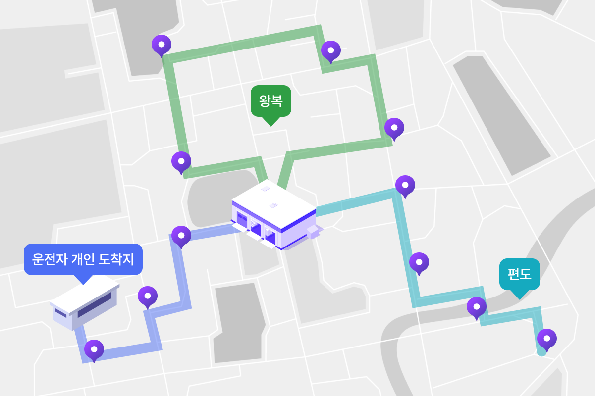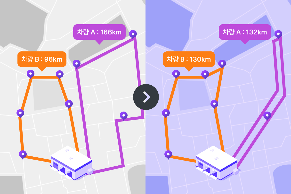 배차 조건에 따라 필요한 최소 차량 수만으로 배송 경로를 구성하여 운영 효율을 극대화