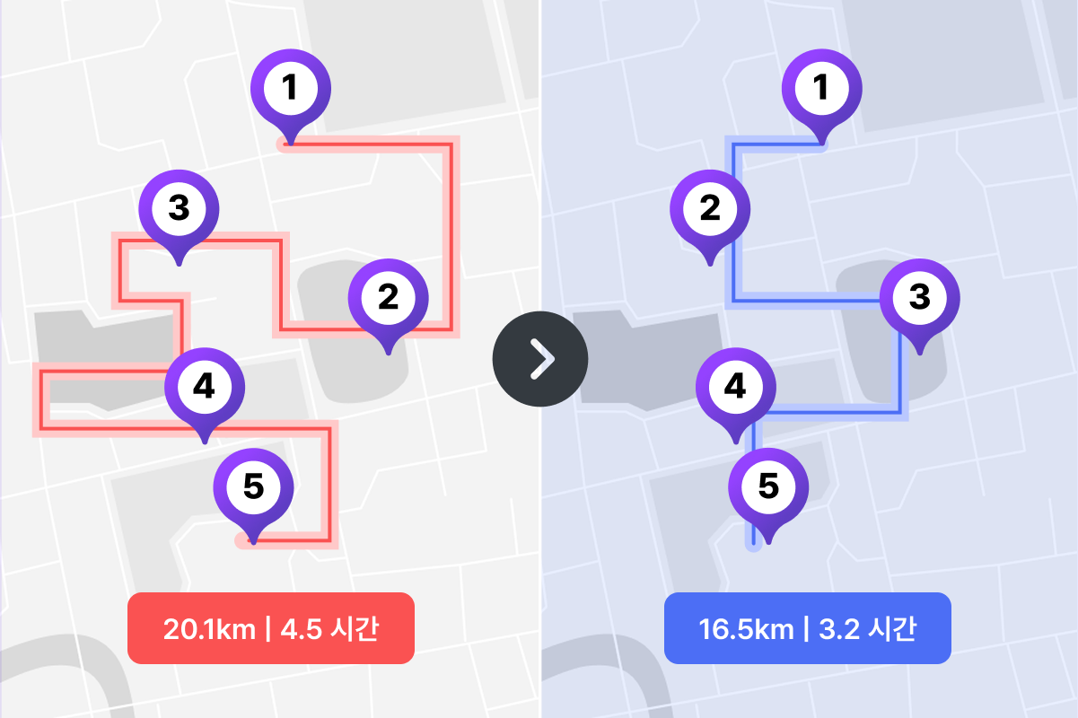 운행 경로를 자동으로 최적화하여 불필요한 거리와 시간을 줄이고,