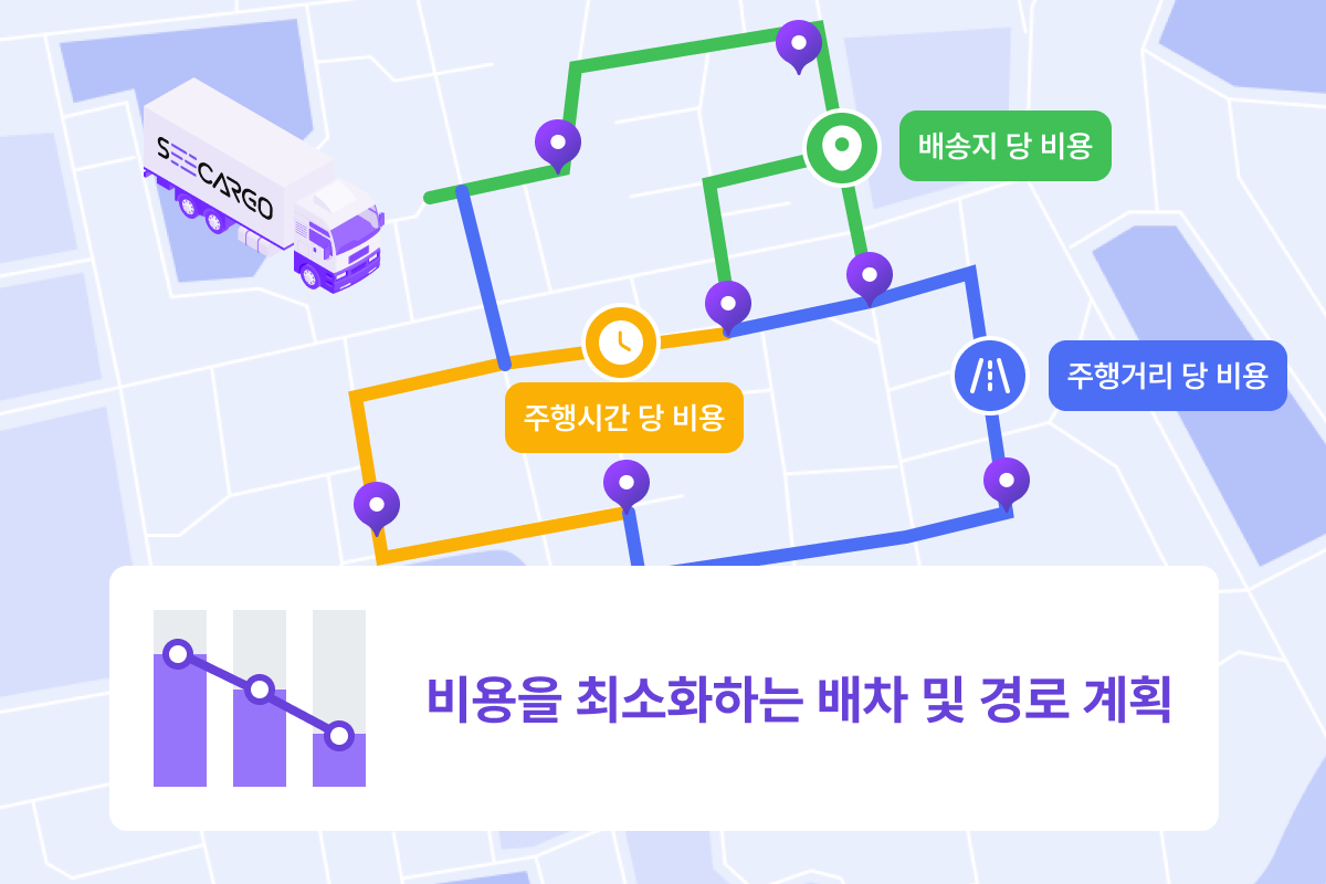 정차 지점·주행 거리·소요 시간을 기준으로 비용을 산정하여 운송비를 최소화합니다.